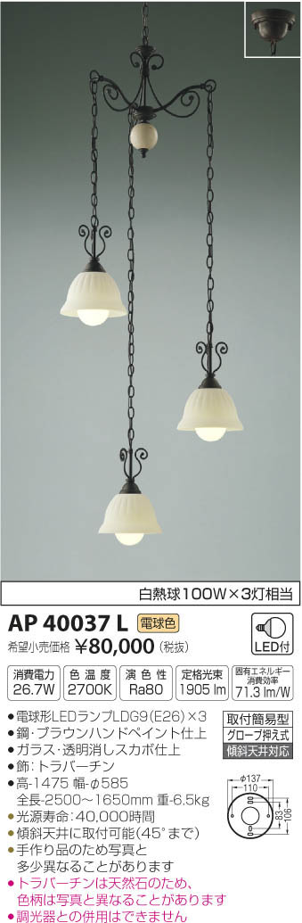 | 補足・注意事項 | ◆消費電力:26.7W ◆色温度:2700K ◆演色性:Ra80 ◆光源寿命:40,000時間 ◆傾斜天井に取付可能(45°まで) ◆手作り品のため写真と多少異なることがあります ◆トラバーチンは天然石のため、色柄は写真と異なることがあります ◆調光器との併用はできません ※色温度:2700K ※白熱球100W×3灯相当 |