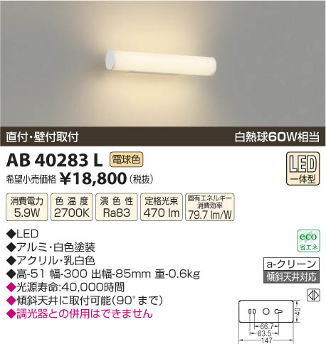 | 補足・注意事項 | ◆消費電力:5.9W ◆色温度:2700K ◆演色性:Ra83 ◆光源寿命:40,000時間 ◆傾斜天井に取付可能(90°まで) ◆調光器との併用はできません ※白熱球60W相当 |