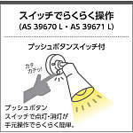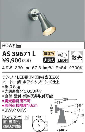 | 補足・注意事項 | ◆消費電力:4.9W ◆色温度:2700K ◆演色性:Ra84 ◆光源寿命:40,000時間 ◆直付・壁付・傾斜天井取付可能 ◆調光器併用不可 ◆照射近接限度10cm |