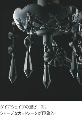 | 部位・材質・色・仕上げ | 本体:鋼・黒色塗装 セード:布・黒色 飾:ガラス・黒色 |