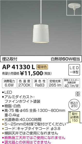 | 補足・注意事項 | ◆消費電力:6.6W ◆色温度:2700K ◆演色性:Ra83 ◆光源寿命:40,000時間 ◆コード:キャブタイヤコードφ3.8 ◆調光器との併用はできません ◆取付必要高:150mm ◆5~25mmの材厚で取付けてください ◆断熱施工天井ではご使用になれません ◆傾斜天井ではご使用になれません ◆白熱球60W相当の明るさ ※白熱球60W相当 |