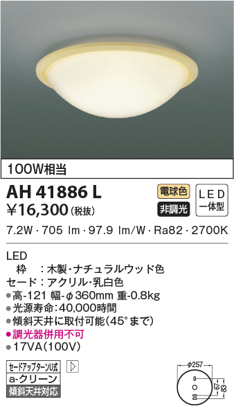 | 補足・注意事項 | ◆消費電力:7.2W ◆光束値:705lm ◆17VA(100V) ◆色温度:2700K ◆演色性:Ra82 ◆光源寿命:40,000時間 ◆調光器併用不可 |