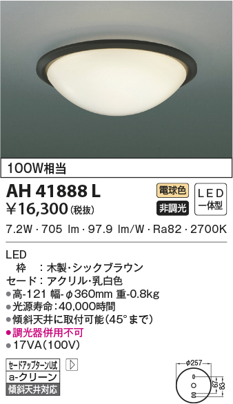 | 補足・注意事項 | ◆消費電力:7.2W ◆光束値:705lm ◆17VA(100V) ◆色温度:2700K ◆演色性:Ra82 ◆光源寿命:40,000時間 ◆調光器併用不可 |