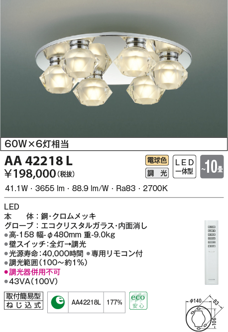 | 補足・注意事項 | ◆消費電力:41.1W ◆色温度:2700K ◆演色性:Ra83 ◆光源寿命:40,000時間 ◆専用リモコン付 ◆調光範囲(100~約1%) ◆調光器併用不可 |