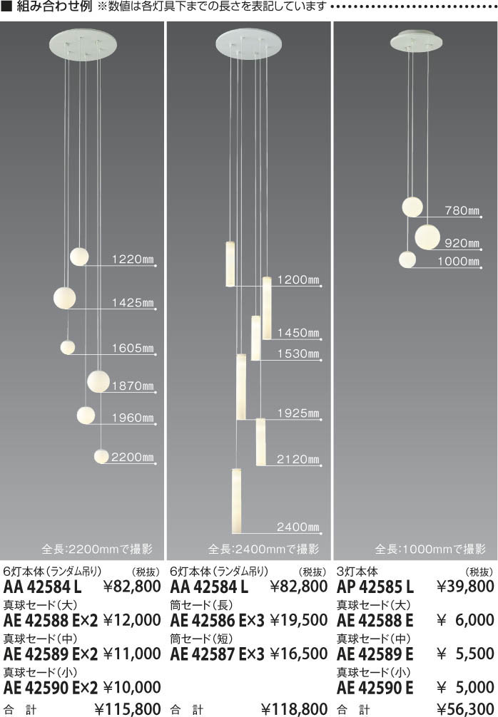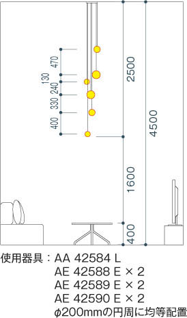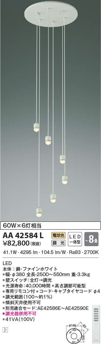 | 補足・注意事項 | ◆消費電力:41.1W ◆色温度:2700K ◆演色性:Ra83 ◆光源寿命:40,000時間 ◆高さ調節可能型 ◆専用リモコン付 ◆コード・キャブタイヤコードφ4 ◆調光範囲(100~約1%) ◆傾斜天井使用不可 ◆別売適合セード:AE42586E~AE42590E ◆調光器併用不可 |