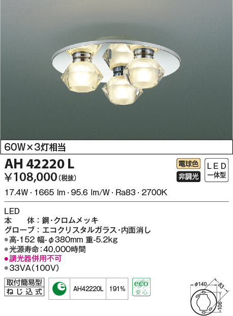 | 補足・注意事項 | ◆消費電力:17.4W ◆色温度:2700K ◆演色性:Ra83 ◆光源寿命:40,000時間 ◆調光器併用不可 |