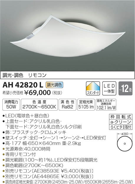 | 補足・注意事項 | ◆消費電力:50W ◆色温度:2700K ◆演色性:Ra82 ◆光源寿命:40,000時間 ◆専用リモコン付 ◆調光範囲(100~約1%)、LED保安灯5段階調光 ◆調色範囲(2700K~6500K) ◆別売リモコン〔AE38593E \5,400(税抜)〕 ◆別売リモコン〔AE44865E \3,000(税抜)〕 ◆調色時定格光束値:2700K時(2450lm・25.0W)/6500K時(2655lm・25.0W) ※色温度:2700K~6500K |