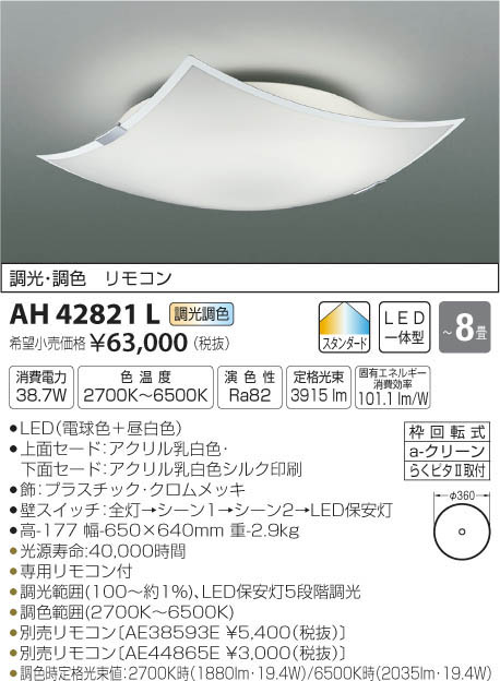 | 補足・注意事項 | ◆消費電力:38.7W ◆色温度:2700K ◆演色性:Ra82 ◆光源寿命:40,000時間 ◆専用リモコン付 ◆調光範囲(100~約1%)、LED保安灯5段階調光 ◆調色範囲(2700K~6500K) ◆別売リモコン〔AE38593E \5,400(税抜)〕 ◆別売リモコン〔AE44865E \3,000(税抜)〕 ◆調色時定格光束値:2700K時(1880lm・19.4W)/6500K時(2035lm・19.4W) ※色温度:2700K~6500K |