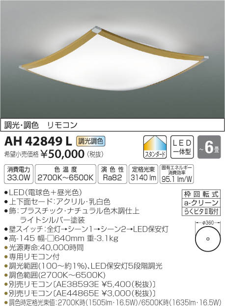 | 補足・注意事項 | ◆消費電力:33W ◆色温度:2700K ◆演色性:Ra82 ◆光源寿命:40,000時間 ◆専用リモコン付 ◆調光範囲(100~約1%)、LED保安灯5段階調光 ◆調色範囲(2700K~6500K) ◆別売リモコン〔AE38593E \5,400(税抜)〕 ◆別売リモコン〔AE44865E \3,000(税抜)〕 ◆調色時定格光束値:2700K時(1505lm・16.5W)/6500K時(1635lm・16.5W) ※色温度:2700K~6500K |
