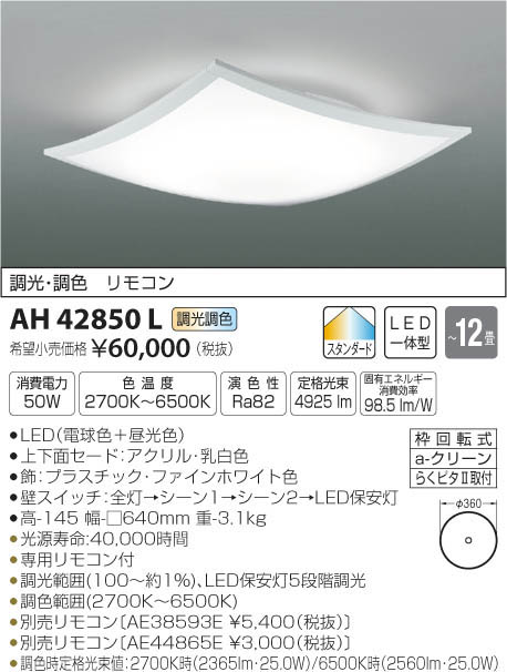 | 補足・注意事項 | ◆消費電力:50W ◆色温度:2700K ◆演色性:Ra82 ◆光源寿命:40,000時間 ◆専用リモコン付 ◆調光範囲(100~約1%)、LED保安灯5段階調光 ◆調色範囲(2700K~6500K) ◆別売リモコン〔AE38593E \5,400(税抜)〕 ◆別売リモコン〔AE44865E \3,000(税抜)〕 ◆調色時定格光束値:2700K時(2365lm・25.0W)/6500K時(2560lm・25.0W) ※色温度:2700K~6500K |