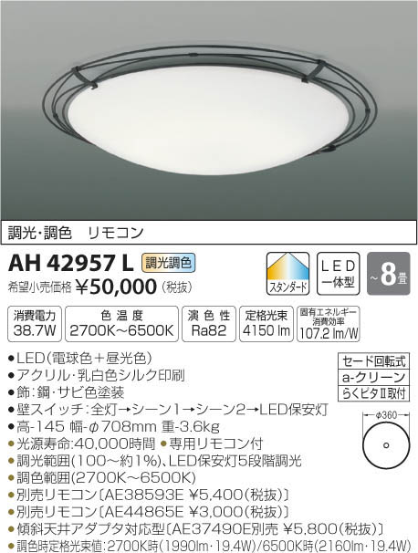 | 補足・注意事項 | ◆消費電力:38.7W ◆色温度:2700K ◆演色性:Ra82 ◆光源寿命:40,000時間 ◆専用リモコン付 ◆調光範囲(100~約1%)、LED保安灯5段階調光 ◆調色範囲(2700K~6500K) ◆別売リモコン〔AE38593E \5,400(税抜)〕 ◆別売リモコン〔AE44865E \3,000(税抜)〕 ◆傾斜天井アダプタ対応型〔AE37490E別売 \5,800(税抜)〕 ◆調色時定格光束値:2700K時(1990lm・19.4W)/6500K時(2160lm・19.4W) ※色温度:2700K~6500K |