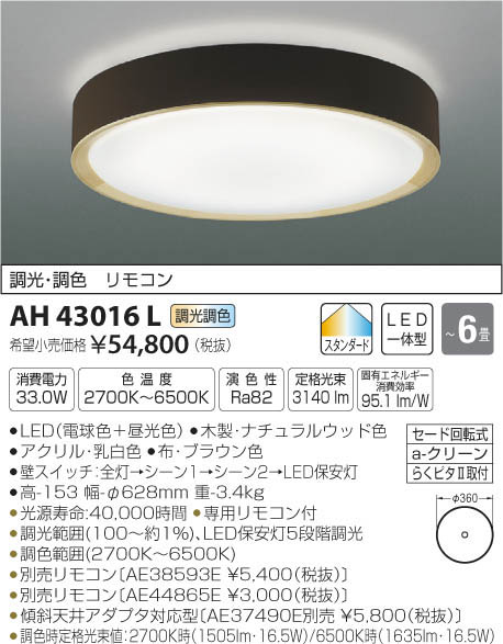 | 補足・注意事項 | ◆消費電力:33W ◆色温度:2700K ◆演色性:Ra82 ◆光源寿命:40,000時間 ◆専用リモコン付 ◆調光範囲(100~約1%)、LED保安灯5段階調光 ◆調色範囲(2700K~6500K) ◆別売リモコン〔AE38593E \5,400(税抜)〕 ◆別売リモコン〔AE44865E \3,000(税抜)〕 ◆傾斜天井アダプタ対応型〔AE37490E別売 \5,800(税抜)〕 ◆調色時定格光束値:2700K時(1505lm・16.5W)/6500K時(1635lm・16.5W) ※色温度:2700K~6500K |