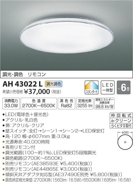 | 補足・注意事項 | ◆消費電力:33W ◆色温度:2700K ◆演色性:Ra82 ◆光源寿命:40,000時間 ◆専用リモコン付 ◆調光範囲(100~約1%)、LED保安灯5段階調光 ◆調色範囲(2700K~6500K) ◆別売リモコン〔AE38593E \5,400(税抜)〕 ◆別売リモコン〔AE44865E \3,000(税抜)〕 ◆傾斜天井アダプタ対応型〔AE37490E別売 \5,800(税抜)〕 ◆調色時定格光束値:2700K時(1560lm・16.5W)/6500K時(1695lm・16.5W) ※色温度:2700K~6500K |