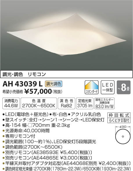 | 補足・注意事項 | ◆消費電力:44.6W ◆色温度:2700K ◆演色性:Ra82 ◆光源寿命:40,000時間 ◆専用リモコン付 ◆調光範囲(100~約1%)、LED保安灯5段階調光 ◆調色範囲(2700K~6500K) ◆別売リモコン〔AE38593E \5,400(税抜)〕 ◆別売リモコン〔AE44865E \3,000(税抜)〕 ◆竿縁天井取付アダプタ対応型〔AE44068E別売 \2,400(税抜)〕 ◆調色時定格光束値:2700K時(1780lm・22.3W)/6500K時(1930lm・22.3W) ※色温度:2700K~6500K |