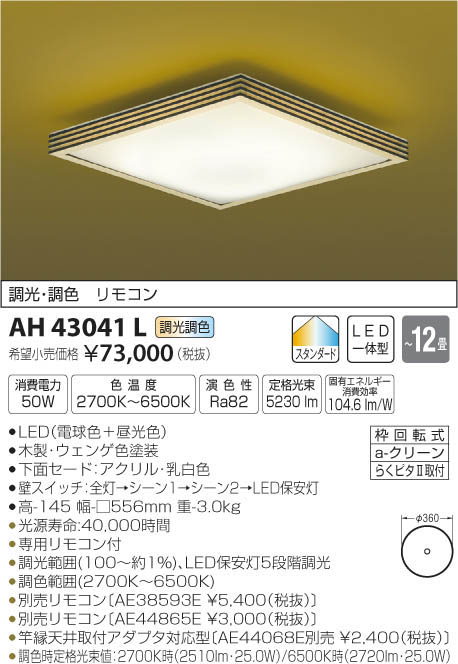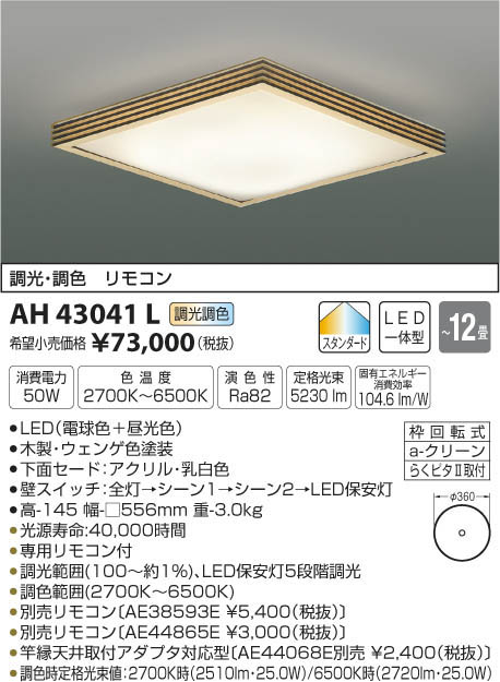 | 補足・注意事項 | ◆消費電力:50W ◆色温度:2700K ◆演色性:Ra82 ◆光源寿命:40,000時間 ◆専用リモコン付 ◆調光範囲(100~約1%)、LED保安灯5段階調光 ◆調色範囲(2700K~6500K) ◆別売リモコン〔AE38593E \5,400(税抜)〕 ◆別売リモコン〔AE44865E \3,000(税抜)〕 ◆竿縁天井取付アダプタ対応型〔AE44068E別売 \2,400(税抜)〕 ◆調色時定格光束値:2700K時(2510lm・25.0W)/6500K時(2720lm・25.0W) ※色温度:2700K~6500K |