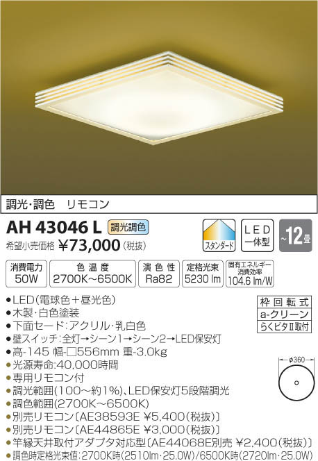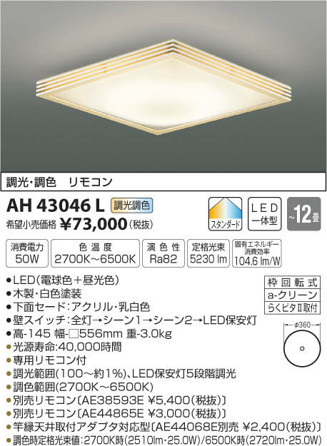 | 補足・注意事項 | ◆消費電力:50W ◆色温度:2700K ◆演色性:Ra82 ◆光源寿命:40,000時間 ◆専用リモコン付 ◆調光範囲(100~約1%)、LED保安灯5段階調光 ◆調色範囲(2700K~6500K) ◆別売リモコン〔AE38593E \5,400(税抜)〕 ◆別売リモコン〔AE44865E \3,000(税抜)〕 ◆竿縁天井取付アダプタ対応型〔AE44068E別売 \2,400(税抜)〕 ◆調色時定格光束値:2700K時(2510lm・25.0W)/6500K時(2720lm・25.0W) ※色温度:2700K~6500K |
