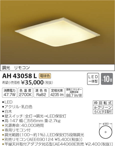 | 補足・注意事項 | ◆消費電力:47.7W ◆色温度:2700K ◆演色性:Ra82 ◆光源寿命:40,000時間 ◆専用リモコン付 ◆調光範囲(100~約1%)、LED保安灯5段階調光 ◆別売リモコン〔AEE690124 \5,400(税抜)〕 ◆竿縁天井取付アダプタ対応型〔AE44068E別売 \2,400(税抜)〕 ※色温度:2700K |