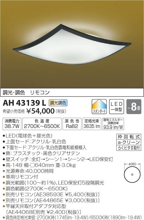 | 補足・注意事項 | ◆消費電力:38.7W ◆色温度:2700K ◆演色性:Ra82 ◆光源寿命:40,000時間 ◆専用リモコン付 ◆調光範囲(100~約1%)、LED保安灯5段階調光 ◆調色範囲(2700K~6500K) ◆別売リモコン〔AE38593E \5,400(税抜)〕 ◆別売リモコン〔AE44865E \3,000(税抜)〕 ◆竿縁天井取付アダプタ対応型〔AE44068E別売 \2,400(税抜)〕 ◆調色時定格光束値:2700K時(1745lm・19.4W)/6500K時(1890lm・19.4W) ※色温度:2700K~6500K |