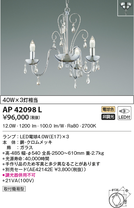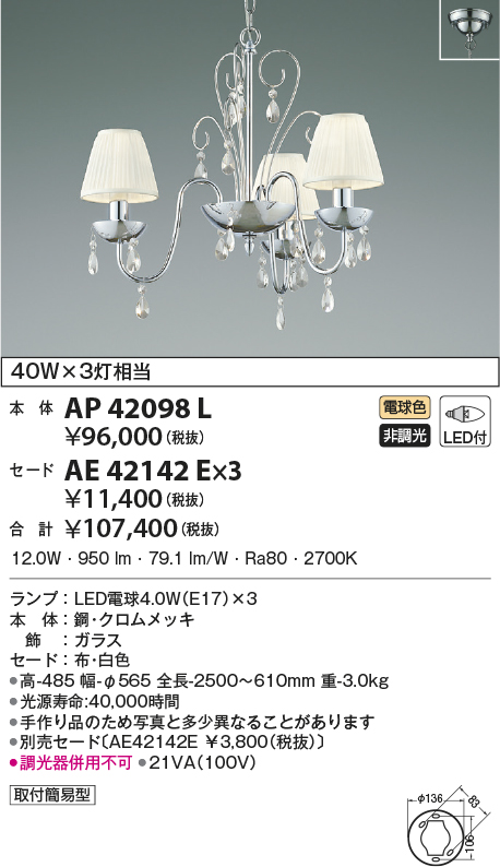 | 補足・注意事項 | ◆消費電力:12.0W ◆光束値:1200lm ◆21VA(100V) ◆色温度:2700K ◆演色性:Ra80 ◆光源寿命:40,000時間 ◆手作り品のため写真と多少異なることがあります ◆別売セード〔AE42142E \3,800(税抜)〕 ◆調光器併用不可 |