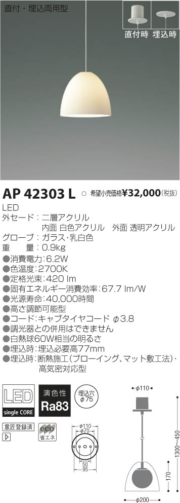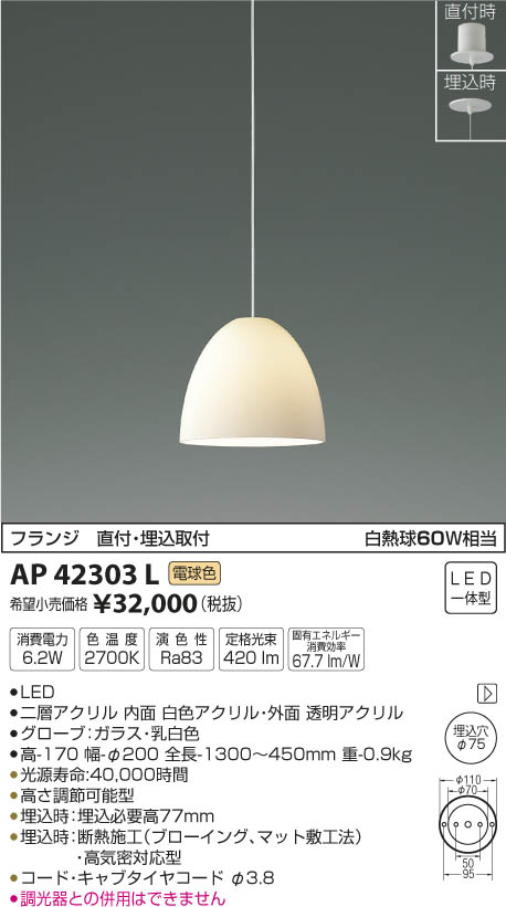 | 補足・注意事項 | ◆消費電力:6.2W ◆色温度:2700K ◆演色性:Ra83 ◆光源寿命:40,000時間 ◆高さ調節可能型 ◆コード:キャブタイヤコード φ3.8 ◆調光器との併用はできません ◆白熱球60W相当の明るさ ◆埋込時:埋込必要高77mm ◆埋込時:断熱施工(ブローイング、マット敷工法)・高気密対応型 ※白熱球60W相当 |
