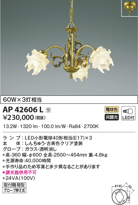 | 補足・注意事項 | ◆消費電力:13.2W ◆光束値:1320lm ◆24VA(100V) ◆色温度:2700K ◆演色性:Ra84 ◆光源寿命:40,000時間 ◆手作り品のため写真と多少異なることがあります ◆調光器併用不可 |