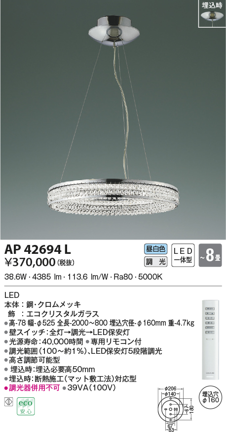 | 補足・注意事項 | ◆消費電力:38.6W ◆色温度:5000K ◆演色性:Ra80 ◆光源寿命:40,000時間 ◆調光範囲(100~約1%)、LED保安灯5段階調光 ◆専用リモコン付 ◆高さ調節可能型 ◆埋込時:埋込必要高50mm ◆埋込時:断熱施工(マット敷工法)対応型 ◆調光器併用不可 |