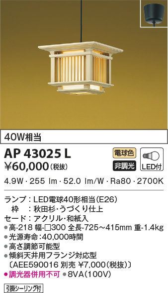 | 補足・注意事項 | ◆消費電力:4.9W ◆色温度:2700K ◆演色性:Ra80 ◆光源寿命:40,000時間 ◆高さ調節可能型 ◆傾斜天井用フランジ対応型〔AEE590016 別売 \7,000(税抜)〕 ◆調光器併用不可 |