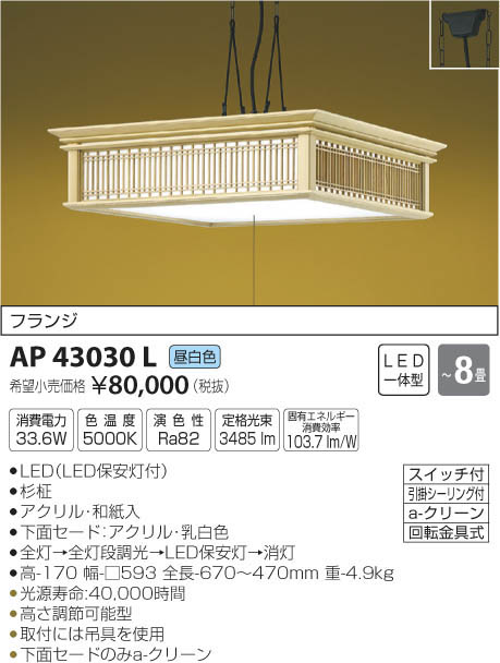 | 補足・注意事項 | ◆消費電力:33.6W ◆色温度:5000K ◆演色性:Ra82 ◆光源寿命:40,000時間 ◆高さ調節可能型 ◆取付には吊具を使用 ◆下面セードのみ a-クリーン ※色温度:5000K |