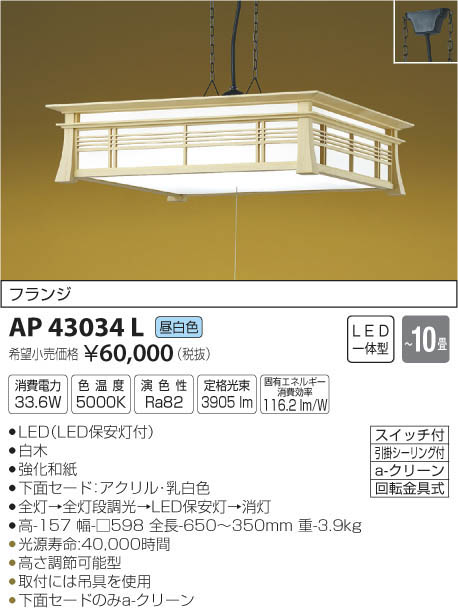 | 補足・注意事項 | ◆消費電力:33.6W ◆色温度:5000K ◆演色性:Ra82 ◆光源寿命:40,000時間 ◆高さ調節可能型 ◆取付には吊具を使用 ◆下面セードのみ a-クリーン ※色温度:5000K |