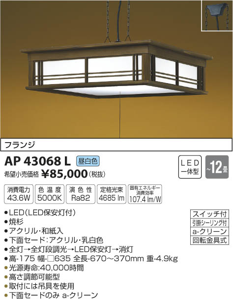| 補足・注意事項 | ◆消費電力:43.6W ◆色温度:5000K ◆演色性:Ra82 ◆光源寿命:40,000時間 ◆高さ調節可能型 ◆取付には吊具を使用 ◆下面セードのみ a-クリーン ※色温度:5000K |