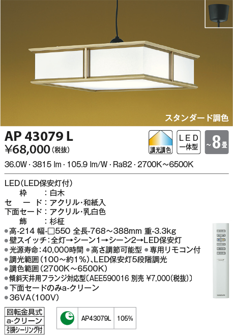 | 補足・注意事項 | ◆消費電力:36.0W ◆色温度:2700K~6500K ◆演色性:Ra82 ◆光源寿命:40,000時間 ◆高さ調節可能型 ◆専用リモコン付 ◆調光範囲(100~約1%)、LED保安灯5段階調光 ◆調色範囲(2700K~6500K) ◆傾斜天井用フランジ対応型〔AEE590016 別売 \7,000(税抜)〕 ◆下面セードのみa-クリーン |