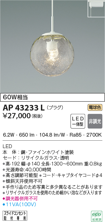 | 補足・注意事項 | ◆消費電力:6.2W ◆色温度:2700K ◆演色性:Ra85 ◆光源寿命:40,000時間 ◆高さ調節可能型 ◆コード・キャブタイヤコードφ4 ◆傾斜天井使用不可 ◆手作り品のため写真と多少異なることがあります ◆リサイクルガラスを使用のため細かい泡などが入ります ◆調光器併用不可 |
