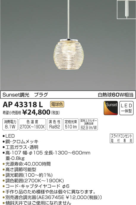 | 補足・注意事項 | ◆消費電力:8.1W ◆色温度:2700K ◆演色性:Ra82 ◆光源寿命:40,000時間 ◆高さ調節可能型 ◆調光範囲(100~約1%) ◆調色範囲(2700K~1900K) ◆コード・キャブタイヤコード φ6 ◆手作り品のため模様や色は個々に異なります。 ◆傾斜天井ではご使用になれません ◆別売適合調光器〔AE36745E \12,000(税抜)〕 ◆別売適合調光器〔AE36745E \12,000(税抜)〕 ※色温度:2700~1900K ※白熱球60W相当 |