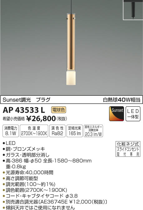 | 補足・注意事項 | ◆消費電力:8.1W ◆色温度:2700K ◆演色性:Ra80 ◆光源寿命:40,000時間 ◆高さ調節可能型 ◆調光範囲(約1~100%) ◆調色範囲(2700K~1900K) ◆コード:キャブタイヤコード φ3.8 ◆別売適合調光器〔AE36745E \12,000(税抜)〕〔AE44056E \15,800(税抜)〕 ◆白熱球40W相当の明るさ ◆傾斜天井ではご使用になれません ※白熱球60W相当 |