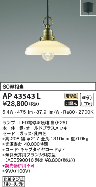 | 補足・注意事項 | ◆消費電力:5.4W ◆光束値:475lm ◆9VA(100V) ◆色温度:2700K ◆演色性:Ra80 ◆光源寿命:40,000時間 ◆コード・キャブタイヤコードφ7 ◆傾斜天井用フランジ対応型〔AEE590016 別売 \8,800(税抜)〕 ◆調光器併用不可 |
