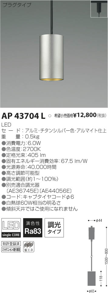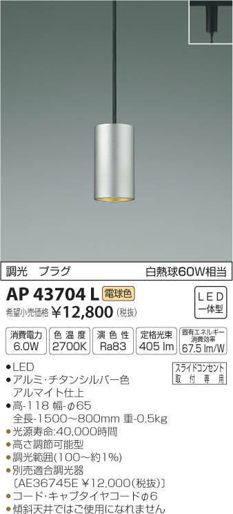 | 補足・注意事項 | ◆消費電力:6.0W ◆色温度:2700K ◆演色性:Ra83 ◆光源寿命:40,000時間 ◆高さ調節可能型 ◆調光範囲(100~約1%) ◆別売適合調光器〔AE36745E \12,000(税抜)〕 ◆コード・キャブタイヤコード φ6 ◆傾斜天井ではご使用になれません ※色温度:2700K ※白熱球60W相当 |