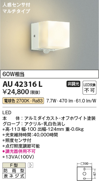 | 補足・注意事項 | ◆消費電力:7.7W ◆光束値:470lm ◆13VA(100V) ◆色温度:2700K ◆演色性:Ra83 ◆光束維持時間:40,000時間 ◆照度センサ付 ◆点灯照度調節可能 ◆調光器併用不可 |