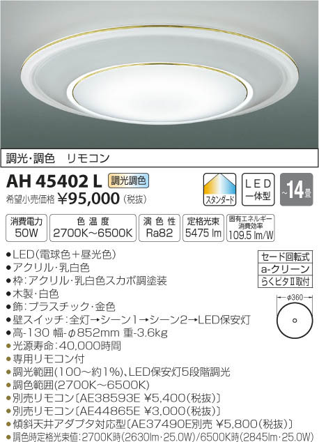 | 補足・注意事項 | ◆消費電力:50W ◆色温度:2700K ◆演色性:Ra82 ◆光源寿命:40,000時間 ◆専用リモコン付 ◆調光範囲(100~約1%)、LED保安灯5段階調光 ◆調色範囲(2700K~6500K) ◆別売リモコン〔AE38593E \5,400(税抜)〕 ◆別売リモコン〔AE44865E \3,000(税抜)〕 ◆傾斜天井アダプタ対応型〔AE37490E別売 \5,800(税抜)〕 ◆調色時定格光束値:2700K時(2630lm・25.0W)/6500K時(2845lm・25.0W) ※色温度:2700K~6500K |