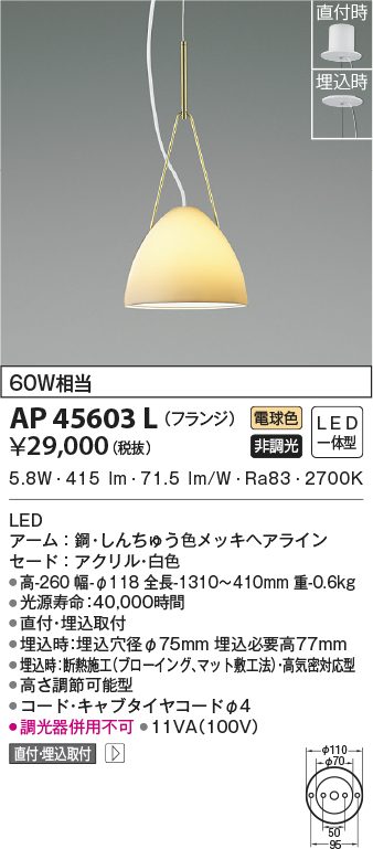| 補足・注意事項 | ◆消費電力:5.8W ◆光束値:415lm ◆11VA(100V) ◆色温度:2700K ◆演色性:Ra83 ◆光源寿命:40,000時間 ◆高さ調節可能型 ◆コード・キャブタイヤコードφ4 ◆埋込時:埋込穴径φ75mm 埋込必要高77mm ◆埋込時:断熱施工(ブローイング、マット敷工法)・高気密対応型 ◆調光器併用不可 |