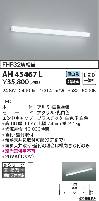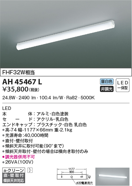 | 補足・注意事項 | ◆消費電力:24.8W ◆色温度:5000K ◆演色性:Ra82 ◆光源寿命:40,000時間 ◆直付・壁付取付 ◆傾斜天井に取付可能(90°まで) ◆傾斜天井取付・壁付の場合は横向き取付のみ ◆調光器併用不可 |