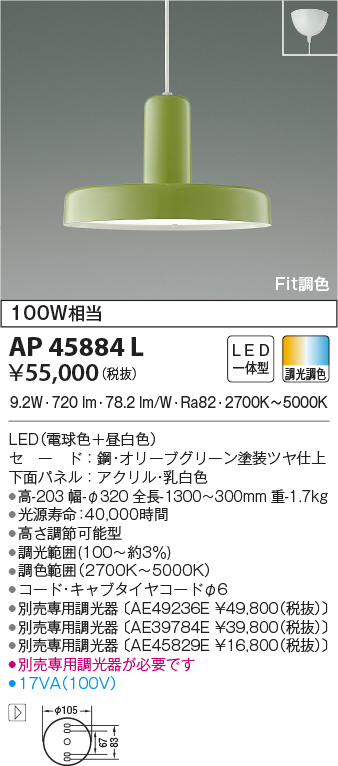 | 補足・注意事項 | ◆消費電力:9.2W ◆色温度:2700K~5000K ◆演色性:Ra82 ◆光源寿命:40,000時間 ◆高さ調節可能型 ◆調光範囲(100~約3%) ◆調色範囲(2700K~5000K) ◆コード・キャブタイヤコードφ6 ◆別売専用調光器〔AE49236E \49,800(税抜)〕 ◆別売専用調光器〔AE39784E \39,800(税抜)〕 ◆別売専用調光器〔AE45829E \16,800(税抜)〕 ◆別売専用調光器が必要です |