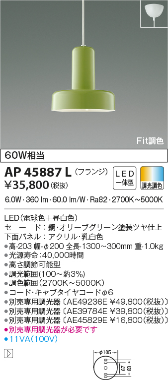 | 補足・注意事項 | ◆消費電力:6.0W ◆色温度:2700K~5000K ◆演色性:Ra82 ◆光源寿命:40,000時間 ◆高さ調節可能型 ◆調光範囲(100~約3%) ◆調色範囲(2700K~5000K) ◆コード・キャブタイヤコードφ6 ◆別売専用調光器〔AE49236E \49,800(税抜)〕 ◆別売専用調光器〔AE39784E \39,800(税抜)〕 ◆別売専用調光器〔AE45829E \16,800(税抜)〕 ◆別売専用調光器が必要です |
