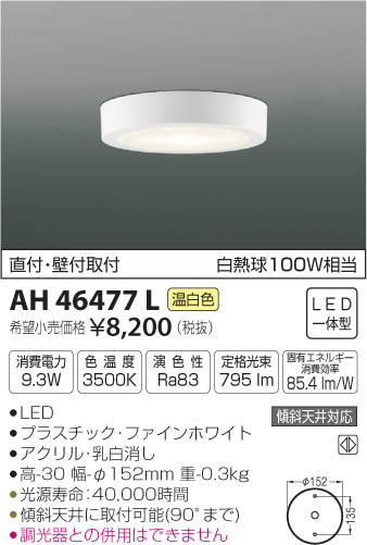 | 補足・注意事項 | ◆消費電力:9.3W ◆色温度:3500K ◆演色性:Ra83 ◆光源寿命:40,000時間 ◆傾斜天井に取付可能(90°まで) ◆調光器との併用はできません ※色温度:3500K ※白熱球100W相当 |