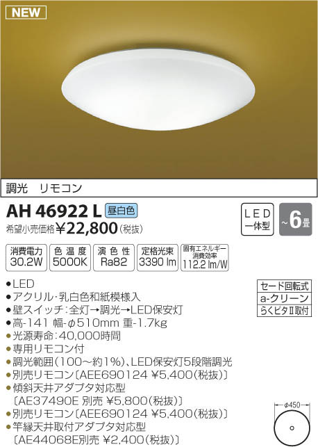 | 補足・注意事項 | ◆消費電力:30.2W ◆色温度:5000K ◆演色性:Ra82 ◆光源寿命:40,000時間 ◆専用リモコン付 ◆調光範囲(100~約1%)、LED保安灯5段階調光 ◆別売リモコン〔AEE690124 \5,400(税抜)〕 ◆傾斜天井アダプタ対応型〔AE37490E別売 \5,800(税抜)〕 ◆竿縁天井取付アダプタ対応型〔AE44068E別売 \2,400(税抜)〕 ※色温度:5000K |