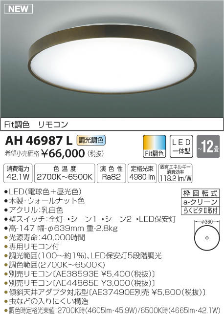 | 補足・注意事項 | ◆消費電力:42.1W ◆色温度:2700K ◆演色性:Ra82 ◆光源寿命:40,000時間 ◆専用リモコン付 ◆調光範囲(100~約1%)、LED保安灯5段階調光 ◆調色範囲(2700K~6500K) ◆別売リモコン〔AE38593E \5,400(税抜)〕 ◆別売リモコン〔AE44865E \3,000(税抜)〕 ◆傾斜天井アダプタ対応型〔AE37490E別売 \5,800(税抜)〕 ◆虫などの入りにくい構造 ◆調色時定格光束値:2700K時(4605lm・45.9W)/6500K時(4665lm・42.1W) ※色温度:2700K~6500K |