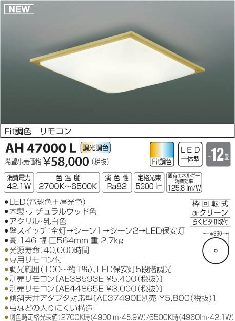 | 補足・注意事項 | ◆消費電力:42.1W ◆色温度:2700K ◆演色性:Ra82 ◆光源寿命:40,000時間 ◆専用リモコン付 ◆調光範囲(100~約1%)、LED保安灯5段階調光 ◆別売リモコン〔AE38593E \5,400(税抜)〕 ◆別売リモコン〔AE44865E \3,000(税抜)〕 ◆傾斜天井アダプタ対応型〔AE37490E別売 \5,800(税抜)〕 ◆虫などの入りにくい構造 ◆調色時定格光束値:2700K時(4900lm・45.9W)/6500K時(4960lm・42.1W) ※色温度:2700K~6500K |