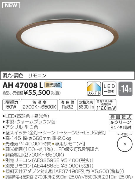 | 補足・注意事項 | ◆消費電力:50W ◆色温度:2700K ◆演色性:Ra82 ◆光源寿命:40,000時間 ◆専用リモコン付 ◆調光範囲(100~約1%)、LED保安灯5段階調光 ◆調色範囲(2700K~6500K) ◆別売リモコン〔AE38593E \5,400(税抜)〕 ◆別売リモコン〔AE44865E \3,000(税抜)〕 ◆傾斜天井アダプタ対応型〔AE37490E別売 \5,800(税抜)〕 ◆調色時定格光束値:2700K時(2690lm・25.0W)/6500K時(2910lm・25.0W) ※色温度:2700K~6500K |