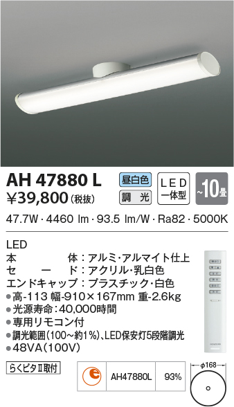 | 補足・注意事項 | ◆消費電力:47.7W ◆色温度:5000K ◆演色性:Ra82 ◆光源寿命:40,000時間 ◆専用リモコン付 ◆調光範囲(100~約1%)、LED保安灯5段階調光 |