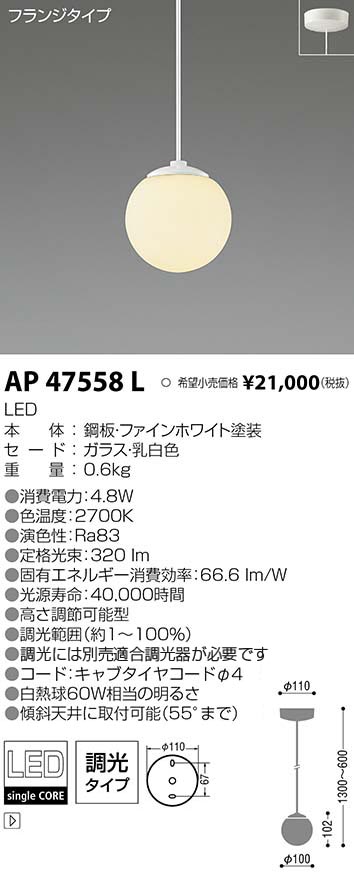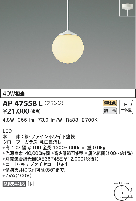 | 補足・注意事項 | ◆消費電力:4.8W ◆色温度:2700K ◆演色性:Ra83 ◆光源寿命:40,000時間 ◆高さ調節可能型 ◆調光範囲(100~約1%) ◆別売適合調光器〔AE36745E \12,000(税抜)〕 ◆コード・キャブタイヤコードφ4 ◆傾斜天井に取付可能(55°まで) |