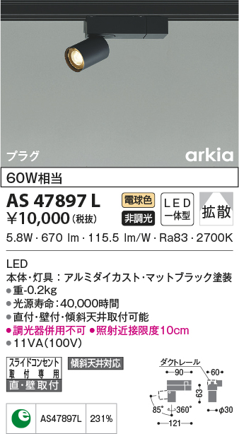 | 補足・注意事項 | ◆消費電力:5.8W ◆色温度:2700K ◆演色性:Ra83 ◆光源寿命:40,000時間 ◆直付・壁付・傾斜天井取付可能 ◆調光器併用不可 ◆照射近接限度10cm |